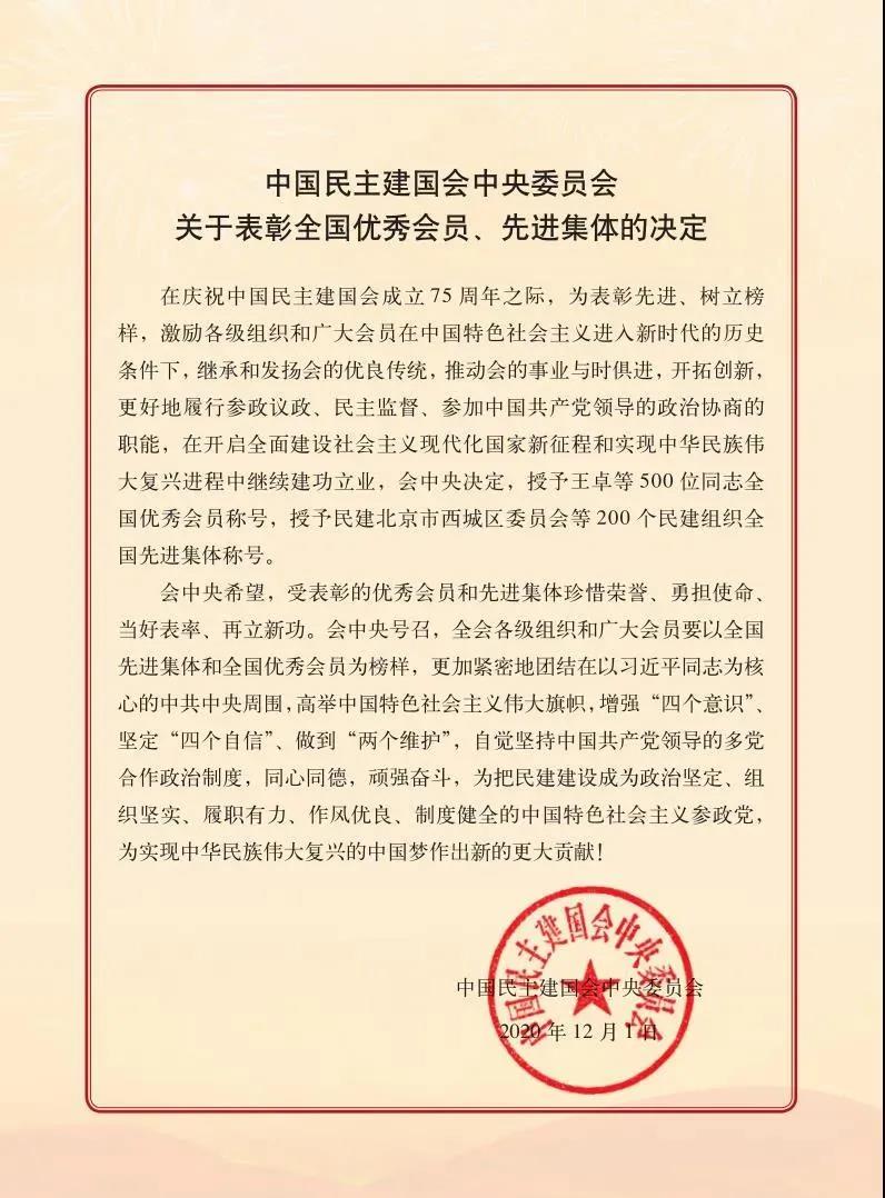 12月1日,民建成立75周年全國優(yōu)秀會員和先進(jìn)集體暨抗擊新冠肺炎疫情先進(jìn)個人和先進(jìn)集體表彰大會在北京隆重舉行。